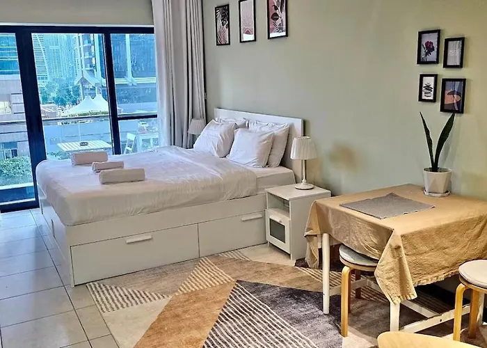 1-slaapkamer Higuests - Close To Metro Charming Studio With Lake Views Dubai ligt binnen 7 km van het Aquaventure Waterpark en binnen een korte wandeling van 5 minuten van Dubai Marina metrostation. Gasten kunnen ontspannen met Turkse stoombaden, een Turks stoombad en een massagekamer, of de Jumeirah Lake Towers, op 450 meter, bezoeken.